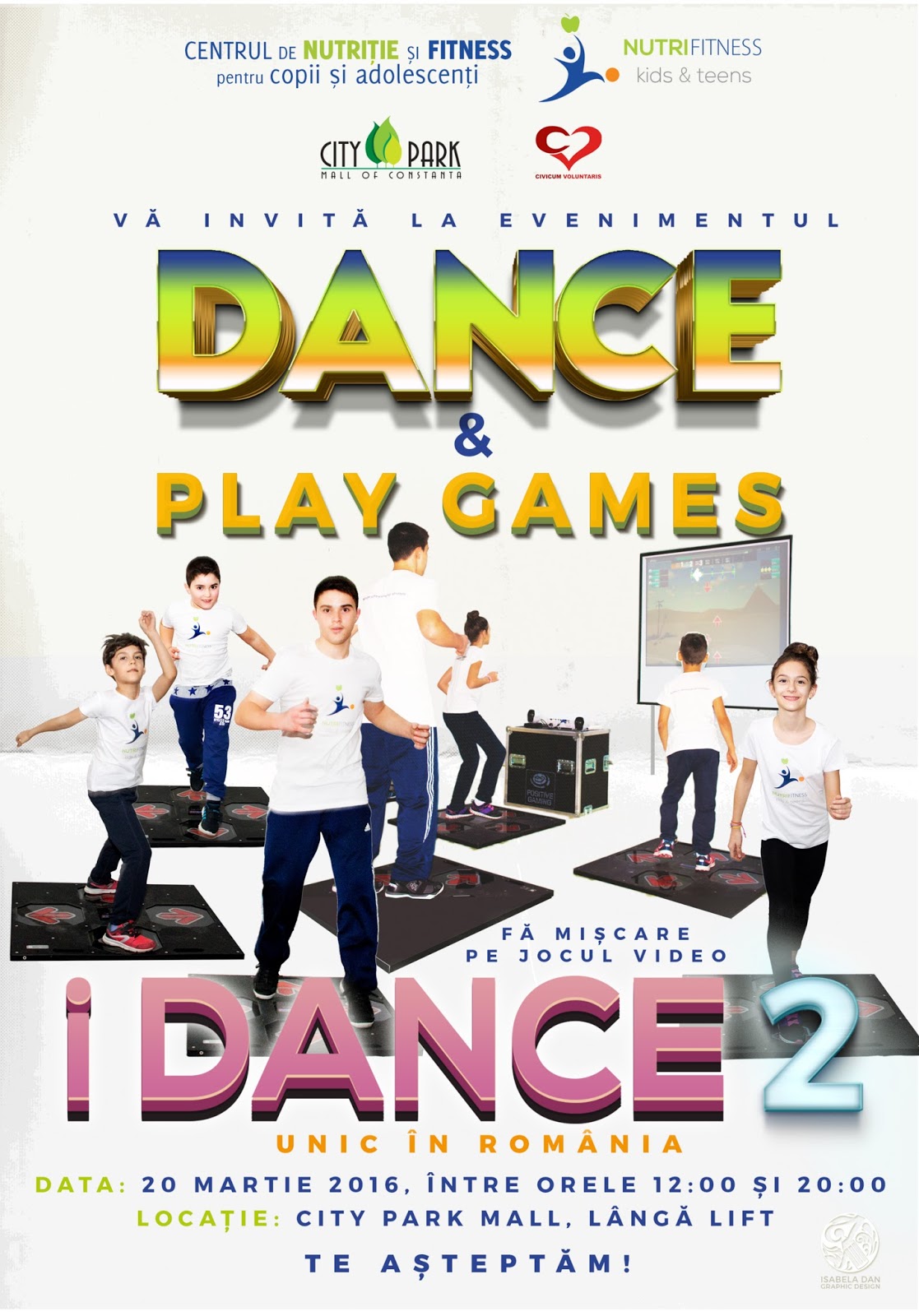 NutriFitness Kids &Teens impreuna cu Asociatia Civicum Voluntaris, te invita pe 20 Martie, intre orele 12-20, la City Park Mall Constanta, la evenimentul “Dance & Play Games”. Fa miscare pe exergame-ul iDANCE 2, nou in Romania !